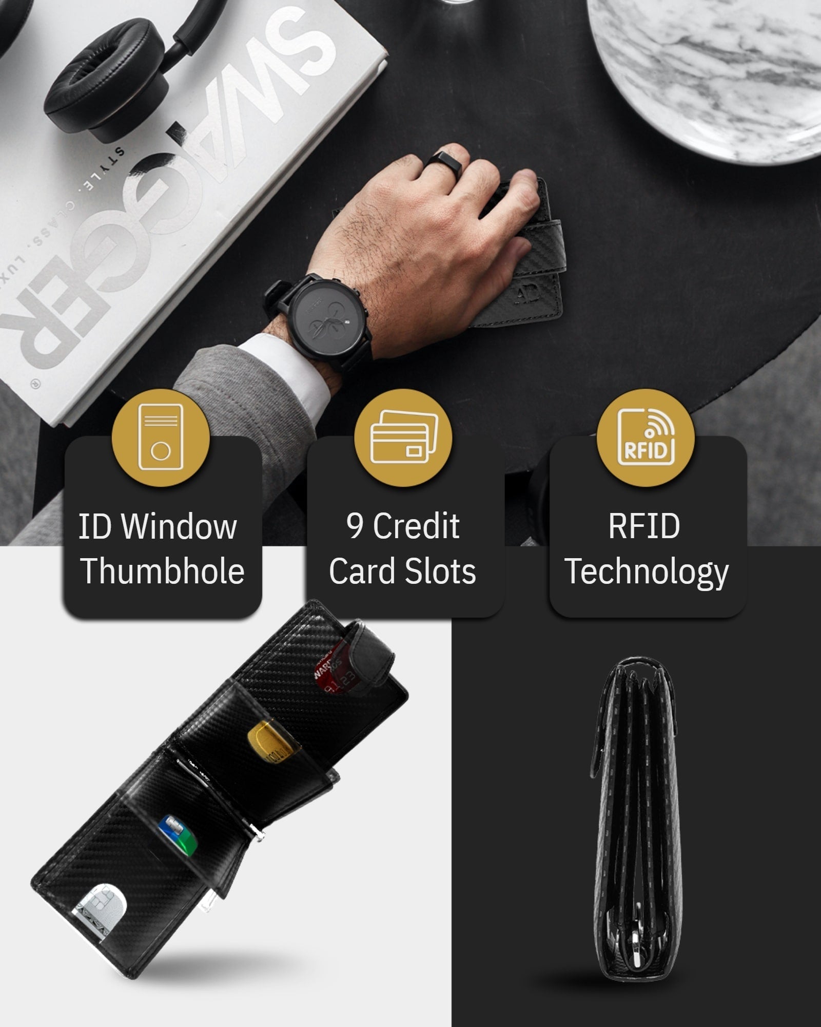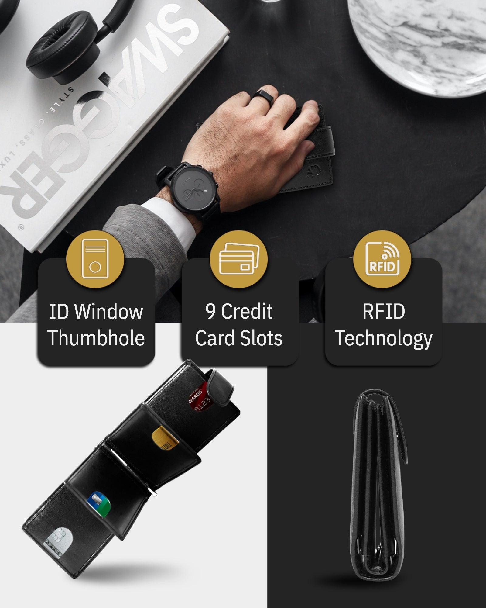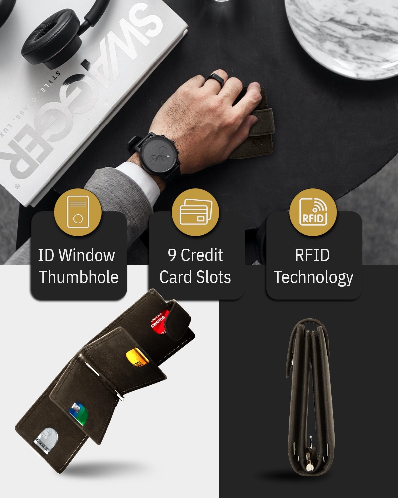 • This Wallet has 9 credit card slots, an ID Window, a removable money clip to hold your cash on the backside, and a snap closure.