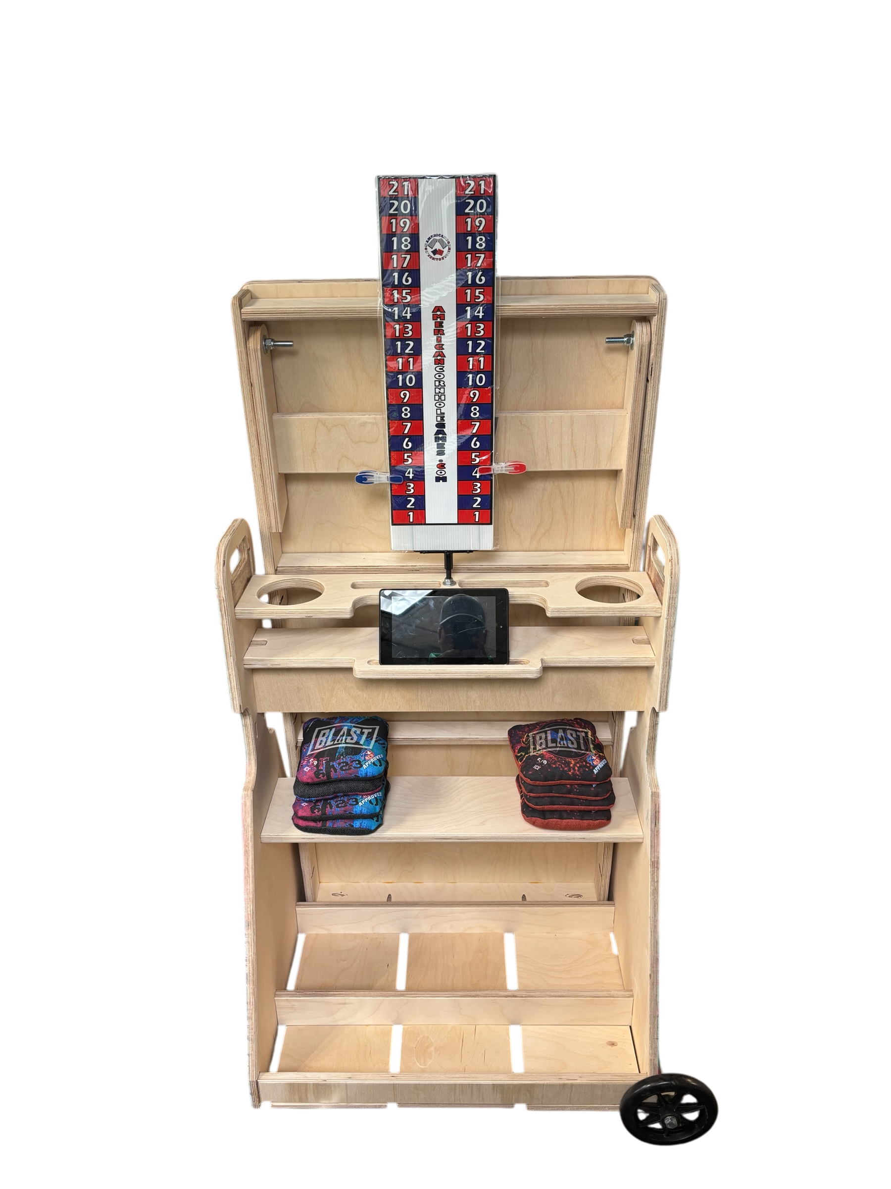Our Cornhole Caddy not only properly stores and protects your boards by keeping them off the cement so they don’t absorb moisture, but also stores your bags and accessories so all your equipment is in one cart.
