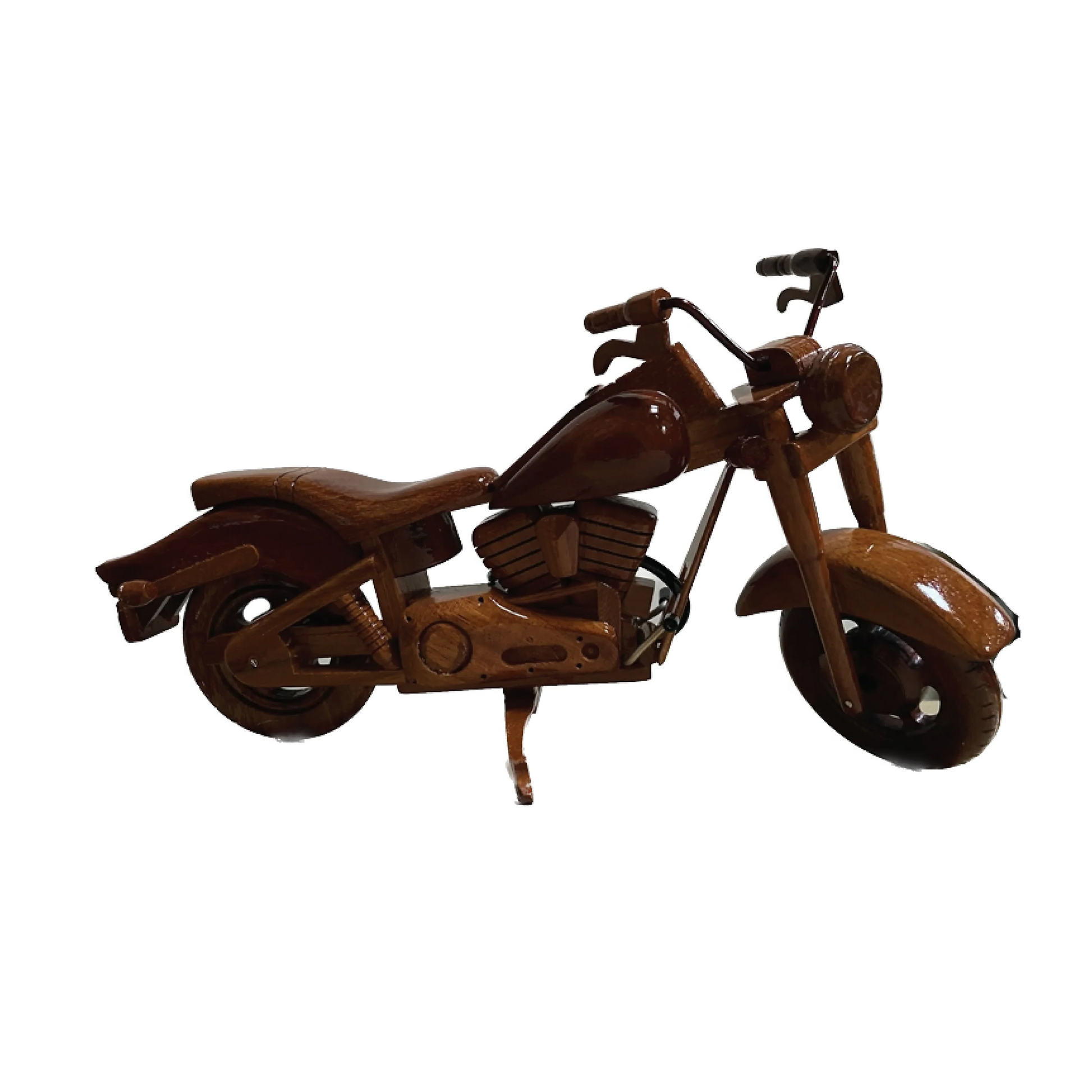 This is handcrafted from mahogany with a working kickstand and movable handlebars. This finely detailed replica is triple coated in high gloss polyurethane finish. 13” Long x 4” Wide x 7” High