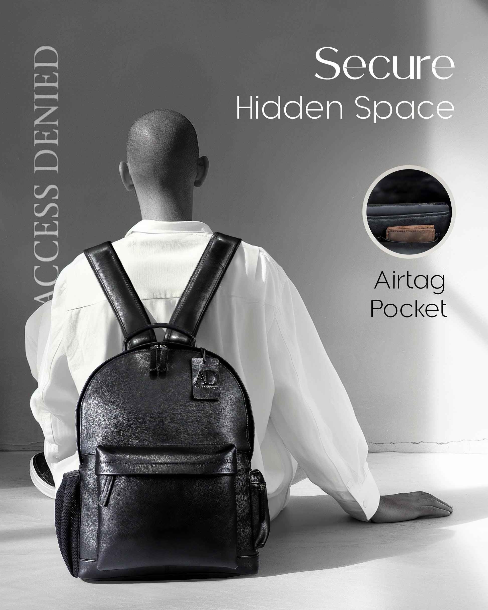 - ADVANCED ANTI-THEFT WITH SECRET AIR TAG HOLDER : Stay confident and worry-free with our Access Denied men's bag - the leather backpack has a concealed Air Tag holder for hidden anti-theft protection and security, allowing you to track your bag and belongings anytime, anywhere.