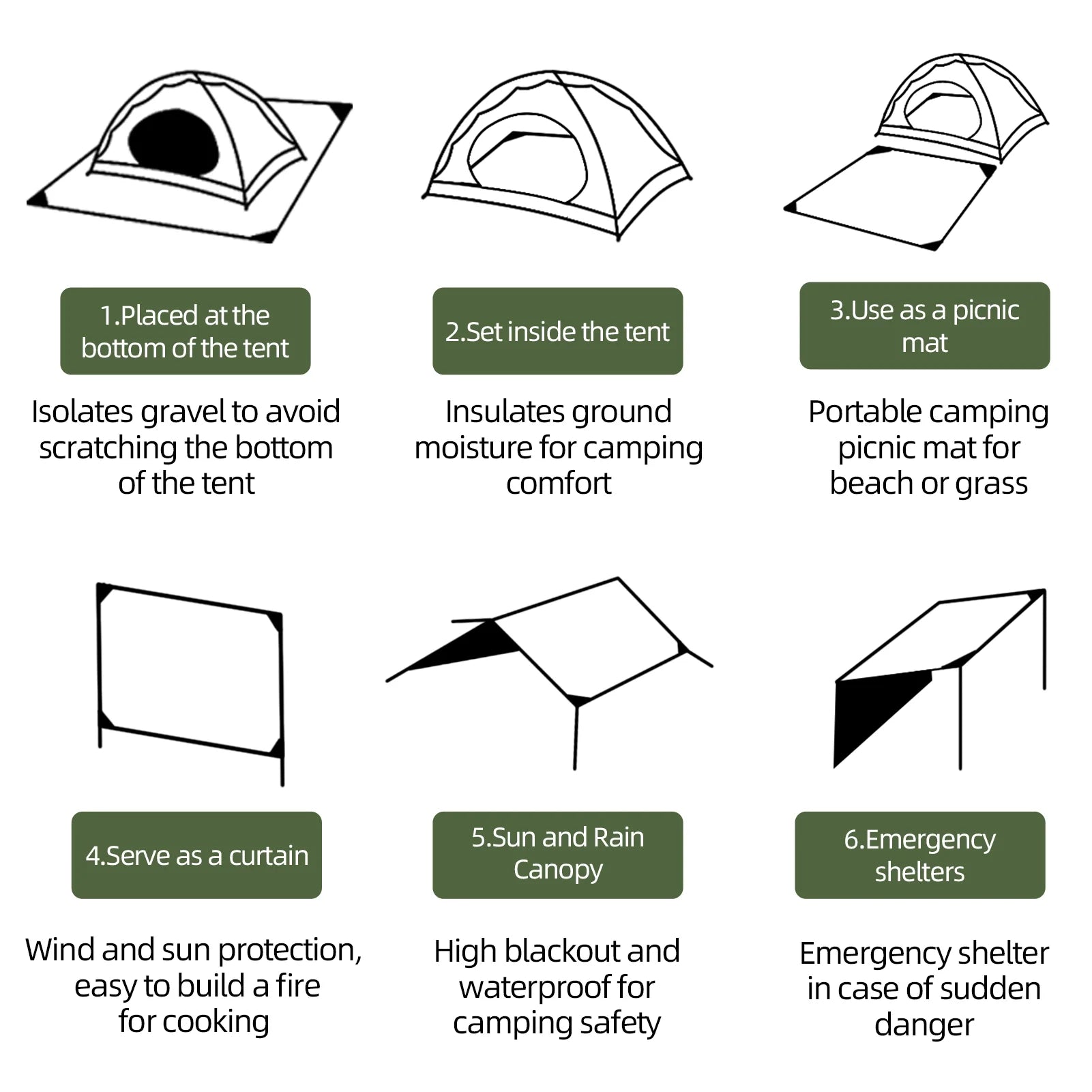 • Multi-Purpose Use: Perfect for picnics, beach trips, camping, hiking, and travel. It can also be used as a groundsheet under tents to block moisture and keep your setup dry.